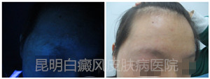 3、Wood检查:眉部白斑,左侧面部胸部有隐性白斑。