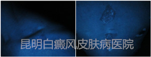 4、Wood检查:白斑部位黑色素脱失,周围有隐形白斑。